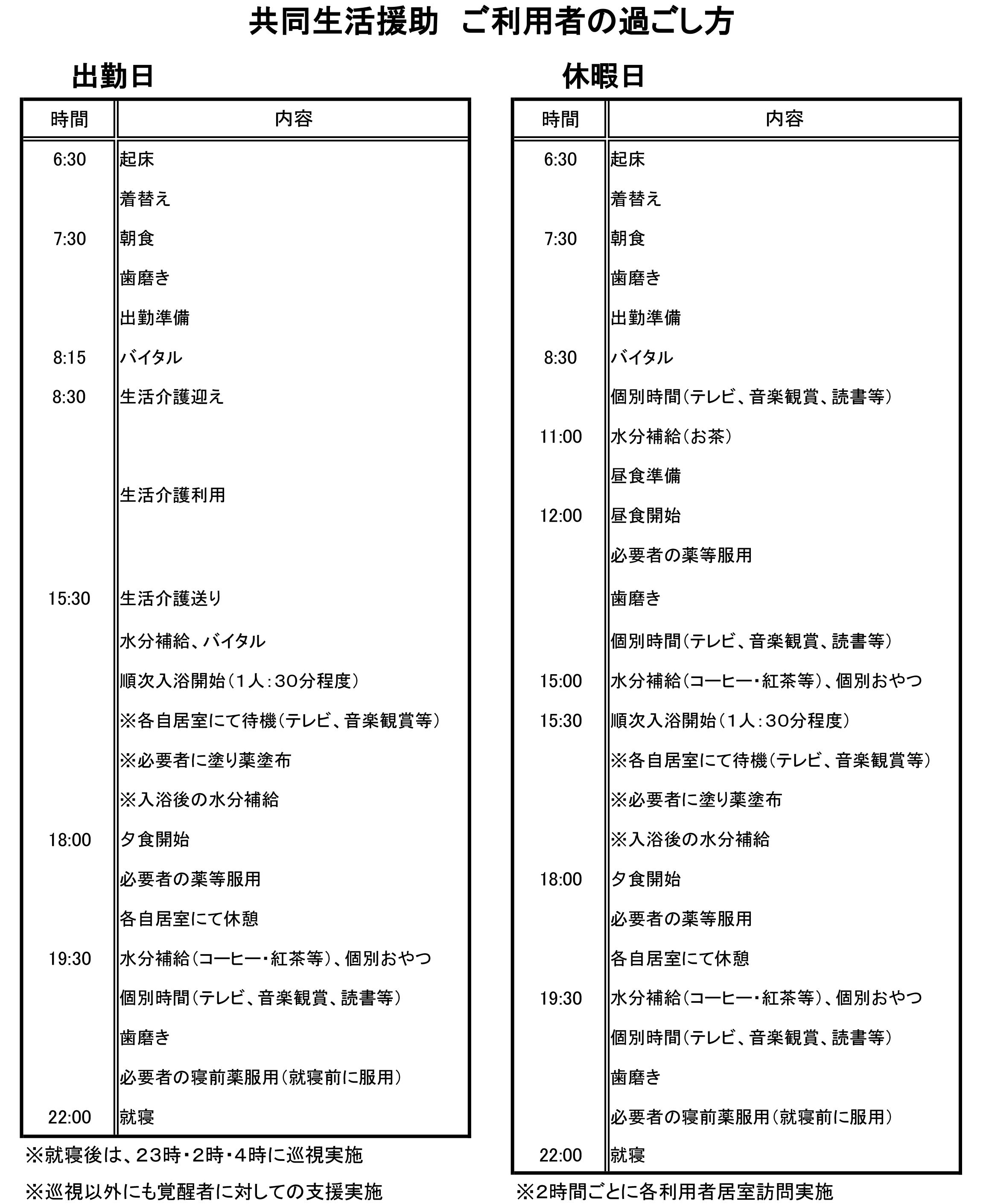 利用者が地域において共同して自立した日常生活又は社会生活を営むことができるよう、当該利用者の身体及び精神の状況並びにその置かれている環境に応じて共同生活住居において相談その他の日常生活上の援助を適切かつ効果的に行うことを目的とします。 ■入浴介助、排泄介助、食事介助等の直接支援 ■調理、洗濯、掃除等の間接支援